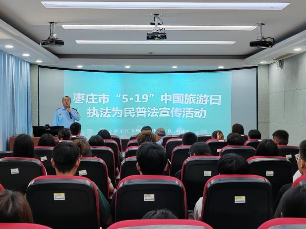 为增强旅游法治宣传教育,提高公司学子旅游安全及规范从业意识,5月19日,必赢76net联合枣庄市文化市场综合执法支队于综合楼1608教室开展中国旅游日普法宣传活动。活动邀请枣庄市文化市场综合执法支队稽查四科负责人胡修岳进行专题报告,枣庄市文化市场综合执法支队副支队长、二级高级主办孙咏、枣庄市文化市场综合执法支队四级主办孙亚如、公司党总支副书记韩建敏、旅游管理专业部分教师及员工参与本次活动。