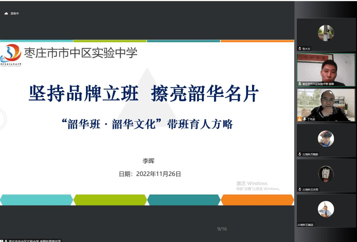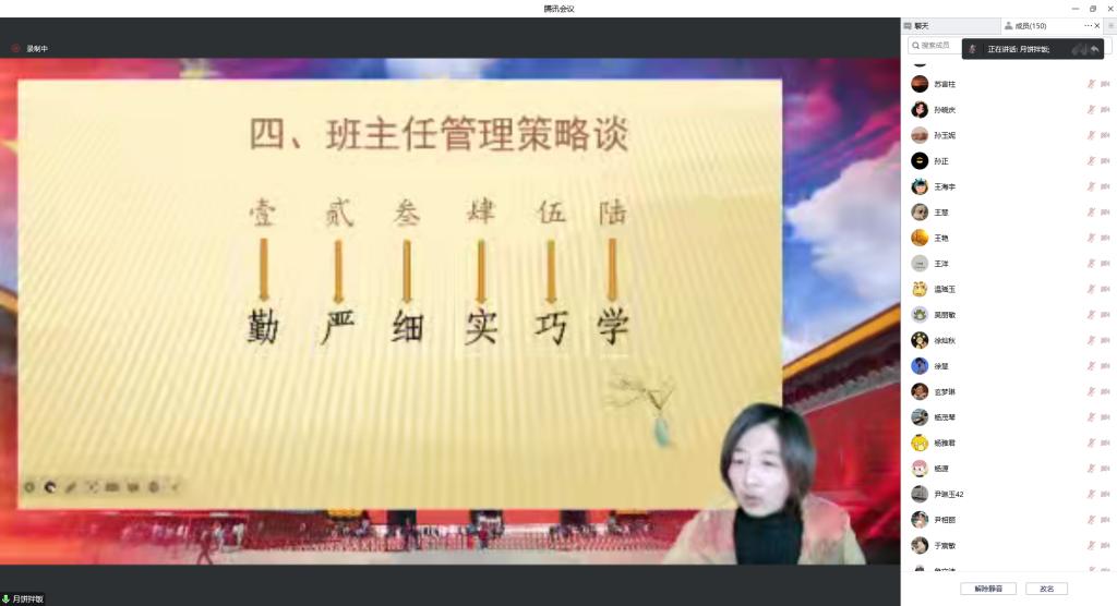 李晖老师分享了“韶华班·韶华文化”带班育人的方略,认为班主任工作中的理念是先“立德”后“树人”,走进员工内心,学会换位思考。以“韶华班”32字方针的班级建设核心理念:“外塑形象,内强素质;制度规范,民主气氛;活动凝聚,方法引领;精神锻造,灵魂点燃”为主线,分享了优秀的班级管理方法。从韶华班,到韶华年级的升华,集中体现了对班主任工作的卓越追求。