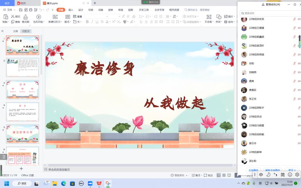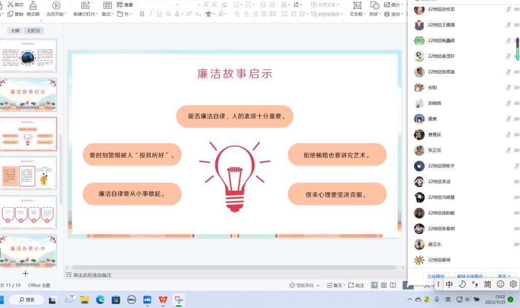 为培养同学们清正廉洁的道德观念,树立廉洁自律风气,弘扬校园正能量,引领社会廉洁风尚,11月19日,必赢76net各班以线上的方式在腾讯会议召开了“廉洁修身,从我做起”主题团日班会。