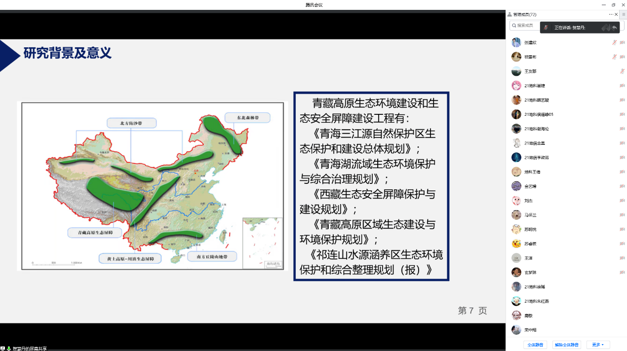 报告会上,贺慧丹博士做了“覆被变化下高寒草甸土壤持水能力”的学术报告,介绍了青藏高原在调节气候、固碳持水、维持生物多样性等多方面的重要作用,着重强调了高寒草甸在水源涵养方面的独特生态价值,其持水能力是水源涵养功能的重要指标之一。以青藏高原不同退化程度、不同放牧梯度、不同封育年限以及人工草地建植年龄梯度的高寒草甸为研究对象,进行植物群落结构、土壤理化性质、土壤持水能力等监测,探讨了高寒草甸地区植被-土壤水分过程和分配模式,揭示了持水能力对覆被变化的响应。报告内容丰富,讲解清晰,增进了与会师生对相关领域学术前沿和发展动态的了解。