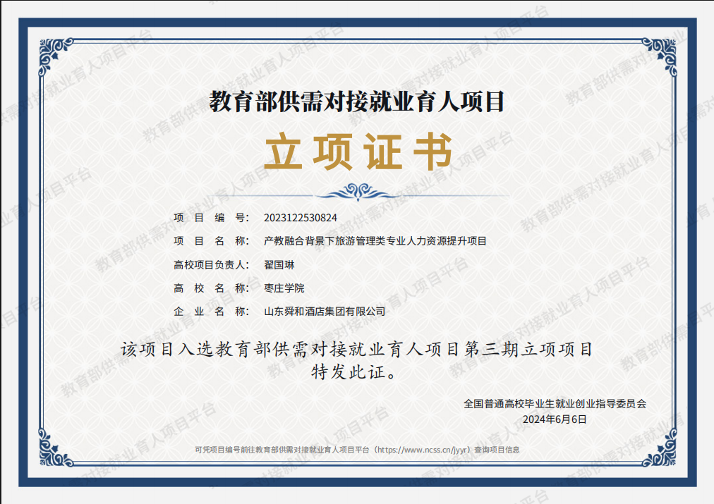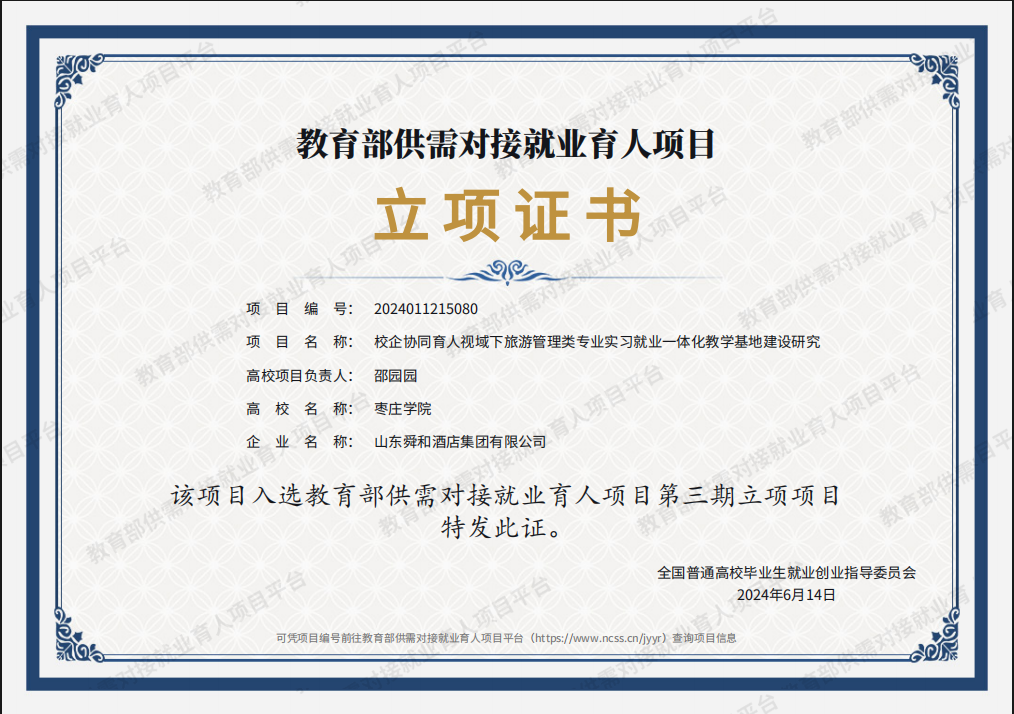教育部高校员工司组织用人单位和高校实施供需对接就业育人项目,是进一步落实党中央、国务院“稳就业”“保就业”的决策部署,是深化产教融合、校企合作,推动人才培养与就业的有机联动、人才供需有效对接的有效途径。学院先后多次组织推进项目申报论证,与用人单位积极联系共同申报,教育部组织专家审核,最终学院2个申报项目成功入选第三期供需对接就业育人项目名单。