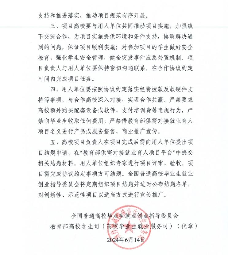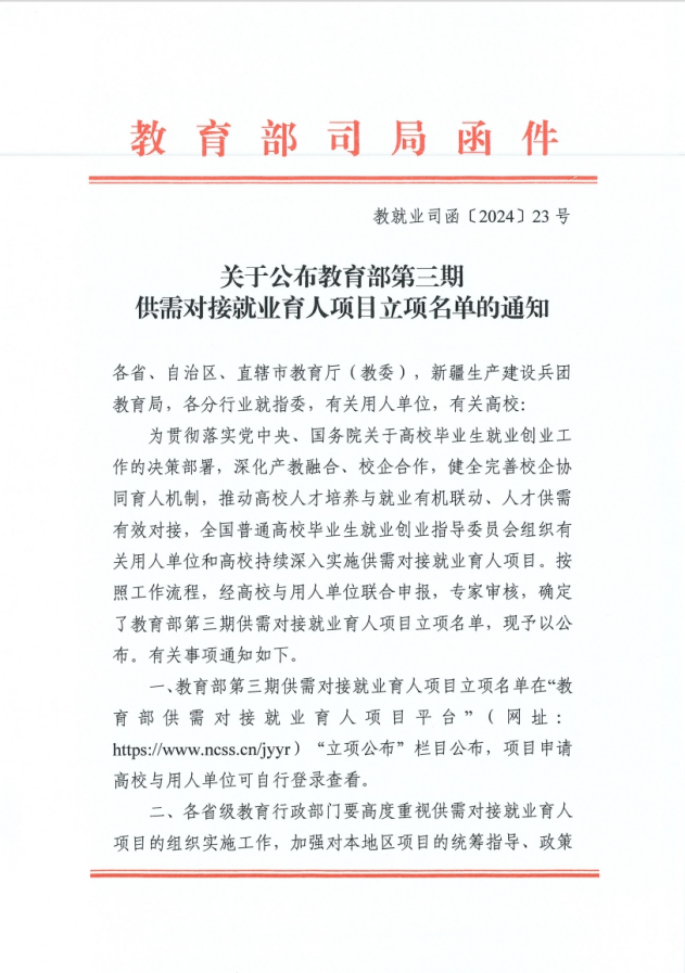 6月14日,教育部高校员工司(高校毕业生就业服务司)发布《关于公布教育部第三期供需对接就业育人项目立项名单的通知》(教就业司函〔2024〕23号),其中公司组织申报的2个供需对接就业育人项目获批立项。